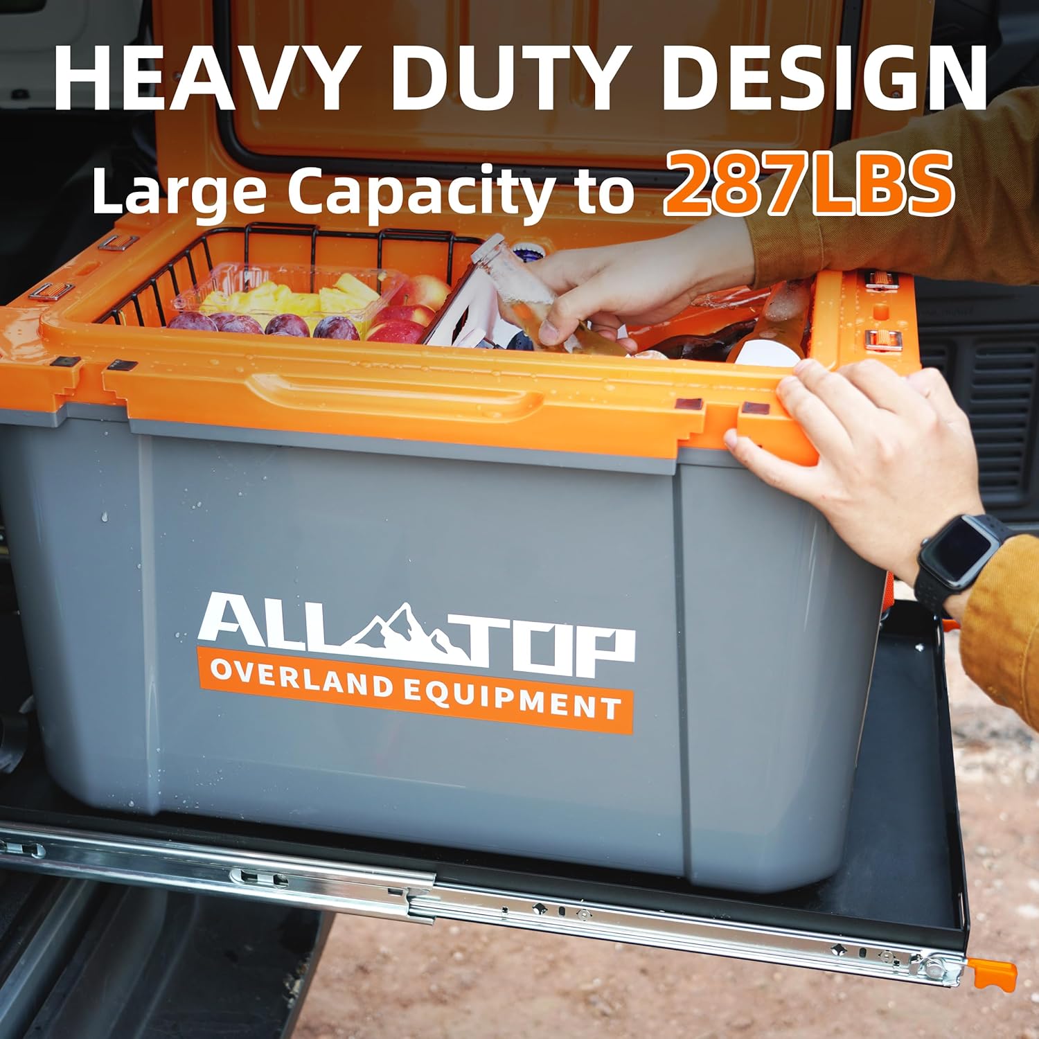 - 【INNOVATIVE】Suits most Portable Vehicle Fridge & Ice Cooler on the market. With ALL-TOP Fridge Slide, you could easily reach your drinks & food from your Fridge and Coolers with its full-extension smooth slides. Two-Hand-Operate Handles are specifically designed for safety.